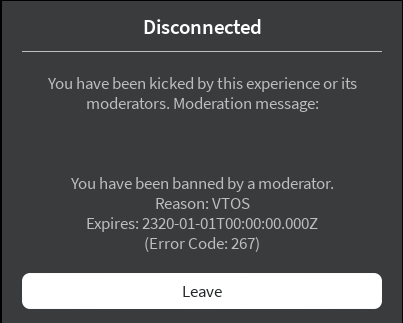 Your Roblox Username & User ID cucaracha453-1324355933 Your Discord ID 511113726124883998 Staff Member Who Banned You (optional) I dont even know What Happened? I have no clue what i was banned for i just clicked join and boom a message Ban Reason (as shown in the ban message) it just said permanent ban violation(s): then go to forums and etc etc Why Should You Be Unbanned? I have 0 clue what i was banned for