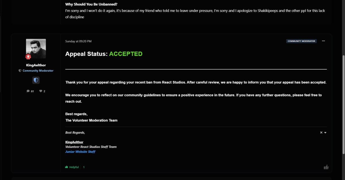 our Roblox Username & User ID Username: AlwayzJax User ID: 313758553 Your Discord ID: 1434756497543401634 Staff Member Who Banned You (optional) System What Happened? I got banned by the system for alting, and playing on a new account. As well as TA/LTAA on it. Ban Reason (as shown in the ban message) AA Why Should You Be Unbanned? I should be unbanned because ive learned that you shouldnt make new accounts to avoid a ban. I just want to play the game again and use my subscription, i do understand though the consequences that take place when this happens at React Studios, and i apologize. I hope you can see this as another chance, and i will 100% prove my worth to play Ventura again. Best, AlwayzJax.