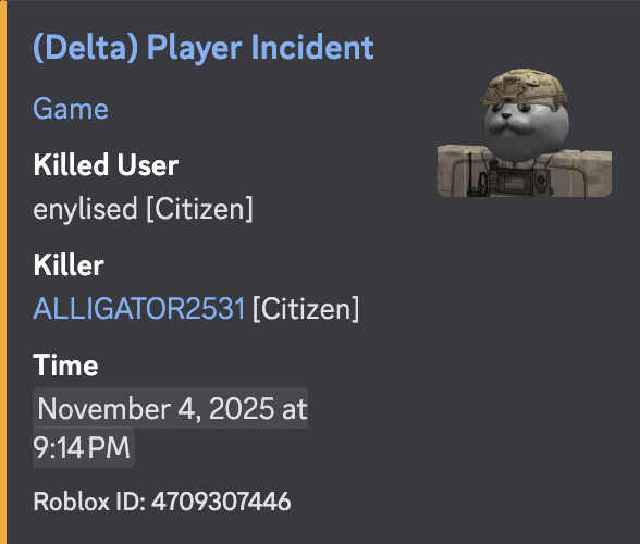 Reporter Roblox Username & ID*:enylised id: 66374021 Reporter Discord ID*:913638670320406541 Offender Roblox Username*: ALLIGATOR2531 Offender Discord Username*: N/A Incident Description*:So i'm about to log off and I pull into a gas station to put away my gun before I leave, then I realized I was in combat so I was going to wait a good minute for it to go by before leaving. Before that happened, some random dude in an RS3 started shooting me for no reason. Username's below, I checked kill logs the moment he killed me. Rules Violated*:RDM Evidence to Support your Claim*:Youtube video: https://www.youtube.com/watch?v=cNDS5qh_kcg