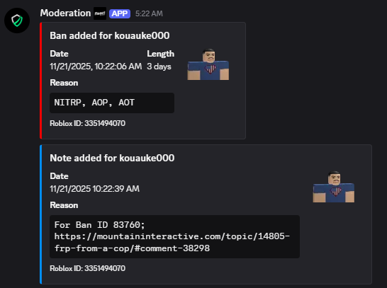 Reporter Roblox Username & ID*:oki12367 | 539715154 Reporter Discord ID*:544899988665401368 Staff Roblox Username*:Rainway23324 Staff Discord Username*: burmanenus Incident Description*:Please explain what happened in extreme detail. List when it happened, who was involved, the context, how you felt after it happened, why you think the staff member was in the wrong. Greetings, I'd like to report this staff member due to the fact of falsely punishing me and falsely providing me with a warning. I will explain the situation first. I was heading towards SP as a SBI Agent and then I had noticed a FD unit with a civilian on their stretcher tilted to the side glitched into the ground. They were crossing a street endangering themselfes. The civilian (grandpa) had stated "EXPLOITER" making me believe that the FD unit was a exploiter, abuser or glitcher as the stretcher was also tilted. I had then stepped out of my vehicle attempting to first unglitch both of them as they were glitched on the ground and afterwards put the FD unit in the back of my vehicle to question them what they were doing. Before being able to do that peacefully though the civilian had started punching me showing no indications of any injuries therefore I believe the stretcher was not necessary to be used by the FD unit. Afterwards the civilian that had punched me was detained and put in my vehicle. The FD unit had stated that they were heading towards their vehicle which was apparently at "target" when they were not heading towards target but SP where I had also seen no FD vehicle. I had then released the FD unit as they had done nothing wrong after concluding my investigation but keeping the civilian detained as they had punched me. They were also provided with medical treatment afterwards as they had requested for medical attention. After the situation had occured maybe a hour later I am quite unsure I was teleported by a moderator and I had explained my side of the story. The moderator then listened to the reporters side and had then reviewed the footage. After not consulting with me rather just making his decision they had warned me for "TA" for just cuffing them when there was obvious reason to be cuffing the individual given the circumstances. The FD unit was also released and no charges were pressed as I had figured that the FD unit was not doing anything wrong even though that they were lying to me and glitched apparently. I was very upset once the moderator had warned me and had hoped for a better outcome that the moderator could've understood my side as I believe I have done nothing wrong and acted correctly. Rules Violated*:False moderation? Evidence to Support your Claim*: https://cdn.medal.tv/ugcc/content-concat/MhlH0ypJvsbpL7yMteIVuw.mp4?auth=exp=1763778600~hmac=e33313223d298f94fffc9c7cfd88d8739d80db58a7bb91c8c3c4e6564f8409d2 https://discord.com/channels/902369439545180180/1083897458591014912/1441531307384635534