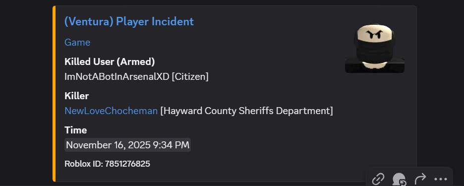 I had a AR on me and was speeding down the road and ran a couple red lights. The officer I am reporting didn't sound his siren once to which I didn't know he was chasing me. I don't even know if he was chasing me or not. I stopped to talk to another innocent officer and tell him he was blocking the way during his traffic stop and RP'd by asking if we got a issue since he wouldn't move. The officer I am reporting then pulls up behind out of nowhere, gets out his car, and full autos his rifle straight into my windshield and deadchecks me too. We had no prior experience before this and this is definitely RDM. (MEDAL CLIP SUBMITTED IN POST) Medal.tv | Record and Share Game ClipsUntitled - Clipped Roblox with Medal.tvWatch Untitled by astronomicaltbh and millions of other Roblox videos on Medal. #roblox, #updatedprojectventura