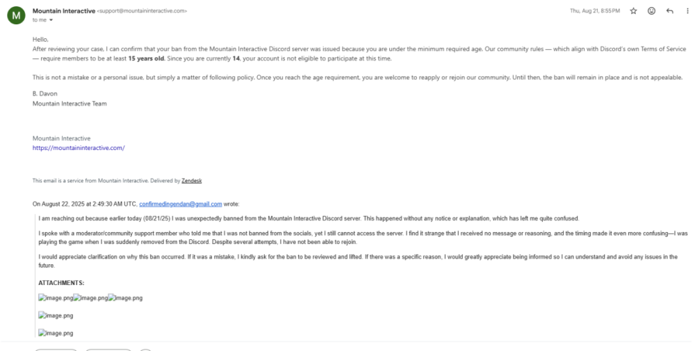 Hello I’ve been ban in the discord server for being underaged and I’d like to be unbanned I was in the server for around 2 weeks i woke up on Saturday to look at the new winter update and it said I was banned so if you could please Unban me or dm for more information my dc is cash141_ the mod that we banned me is brxhuv here’s a screenshot for the rest of the information- dealers