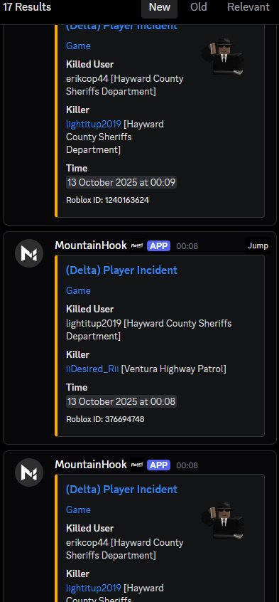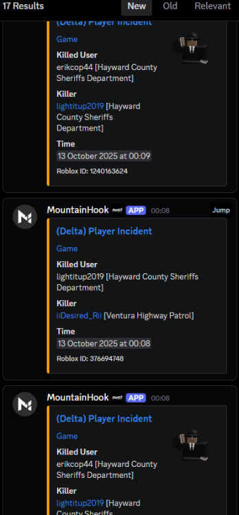 Reporter Roblox Username & ID: jraxqz:2007113900 Reporter Discord ID: 618512994728542239 Offender Roblox Username: lightitup2019 Offender Discord Username: richardthecar Incident Description: yeah idk what this dudes problem is, said he wanted to send a message to whatever. killed me twice and also killed some other cops so just rogue Rules Violated: tk, m-rdm Evidence: https://medal.tv/games/roblox/clips/li0ZQfLJv37xXZ4Hf?invite=cr-MSxPcngsNDM2NjE5NTg&v=25 https://medal.tv/games/roblox/clips/li16I24J5plq_1O_F?invite=cr-MSxxdFEsNDM2NjE5NTg&v=18 (profile of his and killlogs showing him shooting leo as leo)