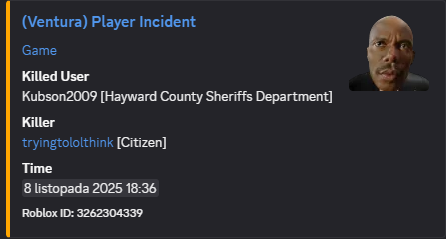 Reporter Roblox Username & ID:Kubson2009 ; 171802419 Reporter Discord ID:631590684201189376 Offender Roblox Username:Firedog329 Offender Discord Username:unknown Incident Description:While I was trying to put a bodybag on the sheriff, a guy wearing a horse mask pulled up, started saying something I wasn’t paying attention to, then jumped out of the vehicle and shot both of us. Rules Violated:- [0] Terminology & Key Concepts:RDM Killing without RP reason. - [2.2] Roleplay Rules – Player versus Player (PvP) (LA / PERRIS):Killing Law Enforcement You may only kill Law Enforcement Officers if you have a valid RP reason and no other options. Valid Kills You must have a valid In-Character (IC) reason to kill or knock someone out. Evidence to Support your Claim:VIDEO: https://youtu.be/bf6HaaMOmZE Kill-Log:
