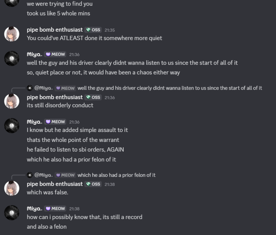 Reporter Roblox Username & ID*:maxim_yeet2, 2992225816 Reporter Discord ID*:1267550821185491085 Offender Roblox Username*: 6dcry Offender Discord Username*: 6dcry. Incident Description*:6dcry issued a false arrest warrant for arresting an Individual who had punched Aerisetta, a Director of VBI. It turns out the individual i had arrested was their friend. Aerisetta, the victim, didnt want to press charges but as that doesnt influence the arrest, i continued to arrest the individual for simple assault and disorderly conduct. After i booked them, a short time later i had gotten a warrant for Abuse of Government Authority, for doing a normal arrest against their friend. These individuals do also not posess hard evidence of me commiting such crime, they did this charge because i had "falsely charged" the individual for simple assault, mind you, the individual punched aerisetta in public, which is disorderly conduct and assault. she said she didnt want to press charges, but that doesnt influence the arrest since that decision is up to the prosecutor. 2 SBI agents, 6dcry and aerisetta then came to the FCPD station and detained me for this warrant, and i was given more charges than listed. Rules Violated*:Team / tool abuse, FRP Evidence to Support your Claim*:maxim_yeet2 started following Player Report VTOS, PD , 6dcry TA, FRP , Aerisetta, NITRP, TA, FRP and 3 others- Aerisetta, NITRP, TA, FRP