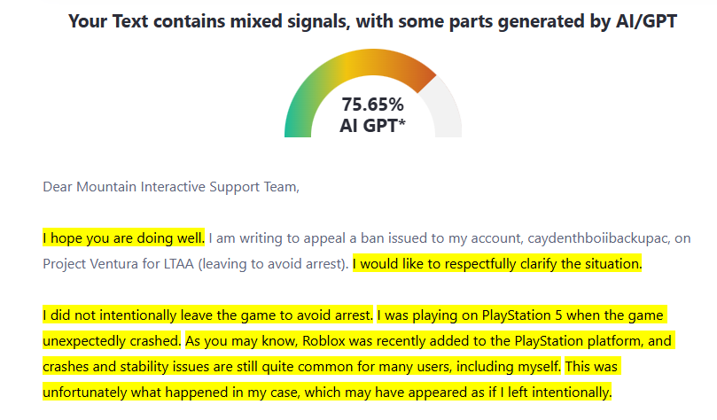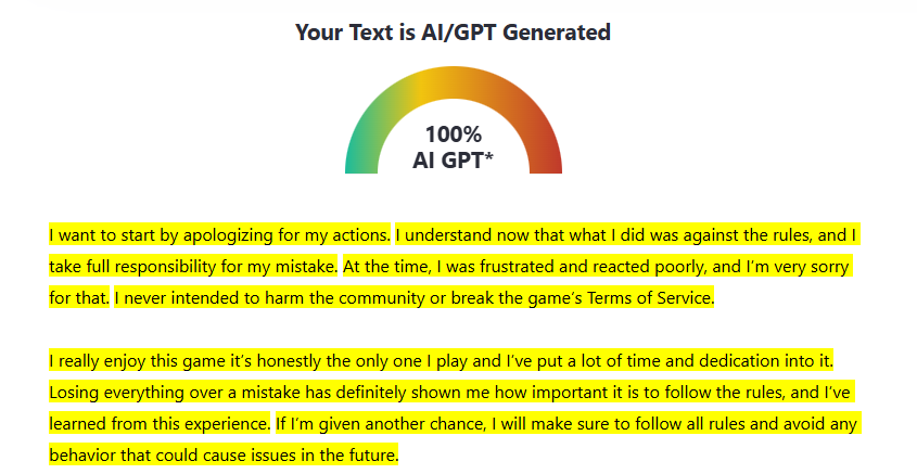 21. Appeal Status: REJECTED Thank you for your appeal regarding your recent ban from React Studios. After careful review, we regret to inform you that your appeal has been rejected. The reason for this decision is as follows: Reason: Using AI to write your appeal wont get you anywhere, matter of fact it will reflect badly on future appeals you make due to your frequent use of AI to write a simple appeal, using AI just shows that you don't care. We encourage you to reflect on our community guidelines to ensure a positive experience in the future. If you have any further questions, please feel free to reach out. Best regards, The Volunteer Moderation Team