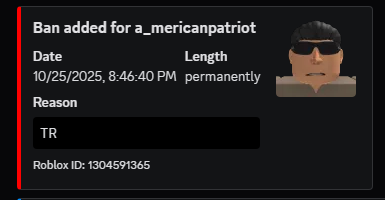 1. a_mericanpatriot - 1304591365 ta_ters - 1304591365 Reason for ban: TR what happened: not really sure why im perm banned for it. had some beef with the person in rp previously, basically ran them over twice, they were later in a gang of people who then targeted us which I did not clip because I don't clip every interaction I have on this game. never warned previously for doing this and was never talked to by an admin or anything. Essentially, person who reported it seems all pissy because they got ran over (who later started targeting us after reporting us). Does not seem that crazy to me, we did not intentionally go after them and kill them like some people. honestly, not sure why it was a perm ban being that I had no previous interaction with an admin about the situation and frankly seemed a little over the edge. had I been notified about what the issue was, I would have fixed it and moved along. even though there was hardly any roleplay in this game because it was constant shootouts, it was relatively enjoyable. for the short roleplays that occurred that I was involved in, quite fun.