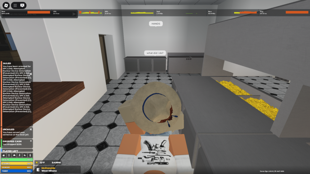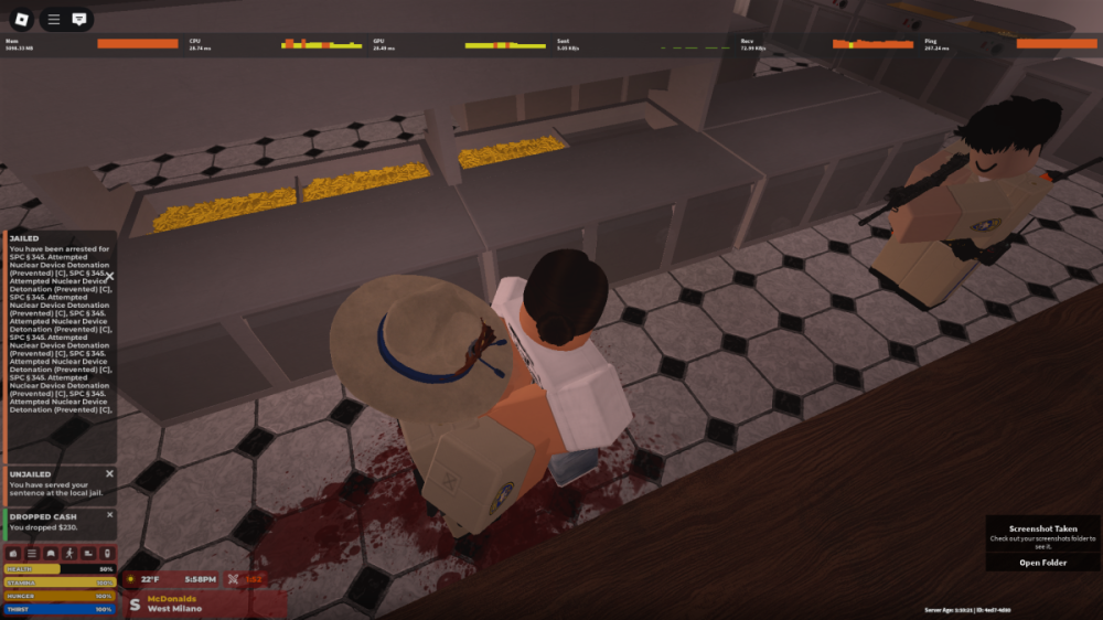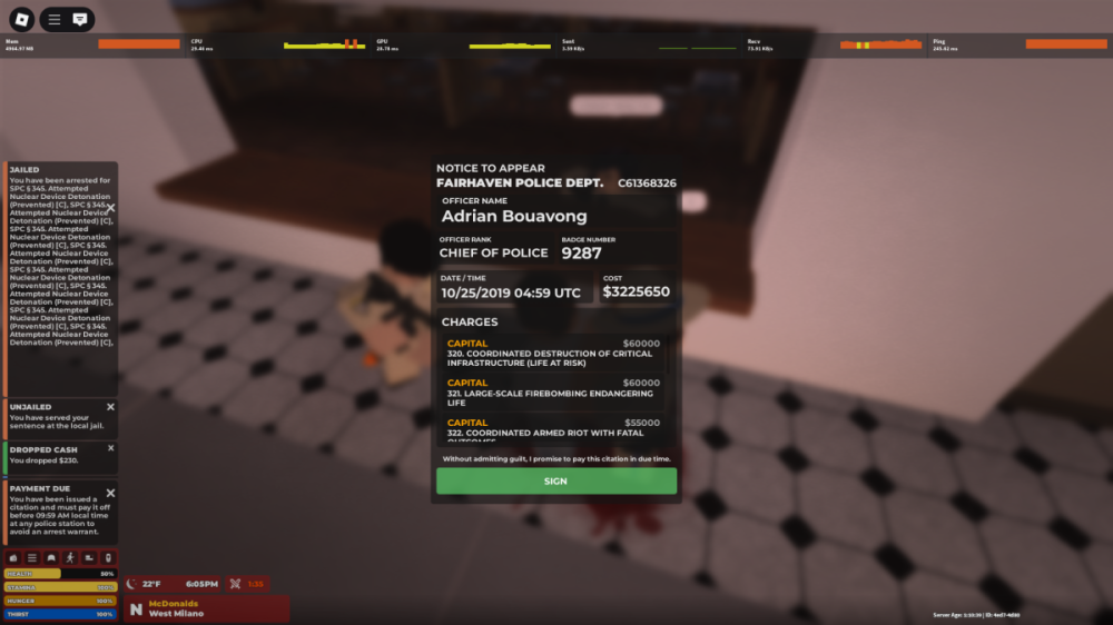 Reporting RBLX User: XxxiseepeolexxX Reporting Discord user: jamalalt123 Offenders user: I do not have his user but his roleplay name “ Adrian Bouavong “ Report: I was attempting to make cash at McDonalds. Then these three troopers came in and unlawfully detained me, pepper sprayed me, shot me, and gave me a unreasonable fine. I only have one name of the trooper, who is named “ Adrian Bouavong “ I just want this citation/fine off my system.