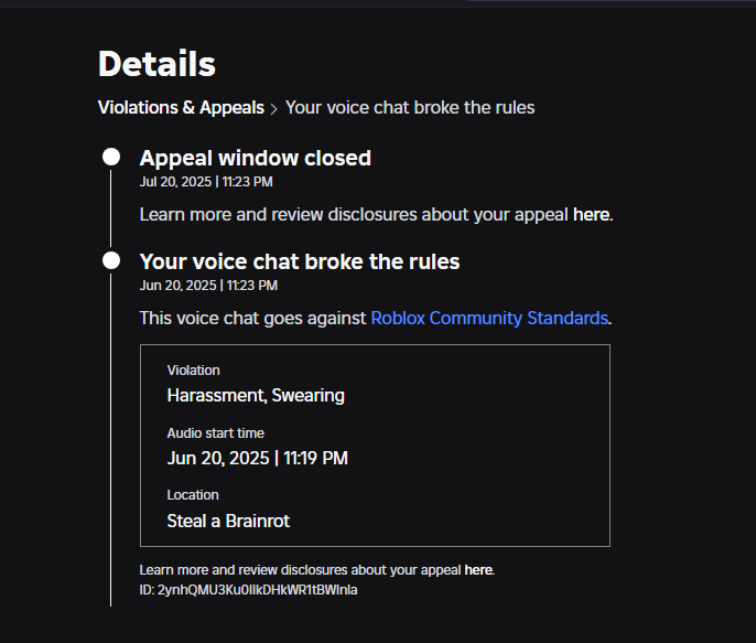 Your Roblox Username & User ID chicken_nuggutman – 1000000 / (ALT) ticklebotom233 - 7781209077 Your Discord ID ilovemydaddy_ - 1138708944865460326 Staff Member Who Banned You (optional) - - - - - - - - What Happened? Date (Forgot). Information: On whatever date this event occurred, I had gotten back from roleplaying after being RDMed (maybe something like this I don't really remember the context) when two mods reviewing another person/interacting with someone violating the rules came up to me/teleported me to them and questioned why I was alt accounting. I replied with a simple phrase: "I'm on my alt because my main account was banned off Roblox, the platform specifically, not Perris California, and that I wasn't trying to avoid a game ban from PC as all I wanted to do was roleplay/drive/chill with others/etc. People involved: me, mod (other was dealing with incident with another player). - Relevant context included prior. Ban Reason (as shown in the ban message) You were banned by this experience or its moderators. Moderation message: PERMANENT BAN Violation(s): AA Appeal on Mountain Interactive's Forums > Game Moderation > Appeals > Game Ban Appeals. You can find out more information about appealing through out communications server. (Error code: 600) Why Should You Be Unbanned? I wish to be unbanned due to the fact Perris California was a game me and my friends enjoyed playing, roleplaying as things such as criminals police forces civilians protesters, etc and was a game that is all around enjoyable. After around around two months of reflection, I decided I should appeal again and see if I could continue playing PC with my friends, begin interacting with the community, and hanging out once again. Ultimately, reflections have been made on my actions and this error of mine has allowed me to evolve into a better person and not partake in such an actions of alt accounting again. If I ever find myself to be banned off the Roblox platform, I will decide not to play Roblox all together for the duration of my ban. Thank you for your time. ADDITIONAL INFORMATION: I hope to be unbanned from React Studios games - I have now found out how to check when I was banned-screenshot attached below with date of ban on my main account, can provide evidence that my intent was to play Peris, not grief and go against (as I claimed) rules without repercussion whilst on my alt account. I wish for a second chance to begin roleplaying again because this platform is mad dry and the React Studios roleplay games are lowkey next level if I'm keeping it real. Please consider this response, evidence below as stated prior.