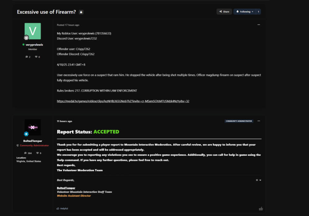 My Roblox User: veryprolewis (781356633) Discord User: veryprolewis7232 Offender user: Crispy7262 Offender Discord: Crispy7262 4/10/25 23:41 GMT+8 User excessively use force on a suspect that ram him. He stopped the vehicle after being shot multiple times. Officer magdump firearm on suspect after suspect fully stopped his vehicle. Rules broken: 217. CORRUPTION WITHIN LAW ENFORCEMENT https://medal.tv/games/roblox/clips/lezNHlb365GNobThZ?invite=cr-MSxmSGYsMTU5Mzk4NzYy&v=32