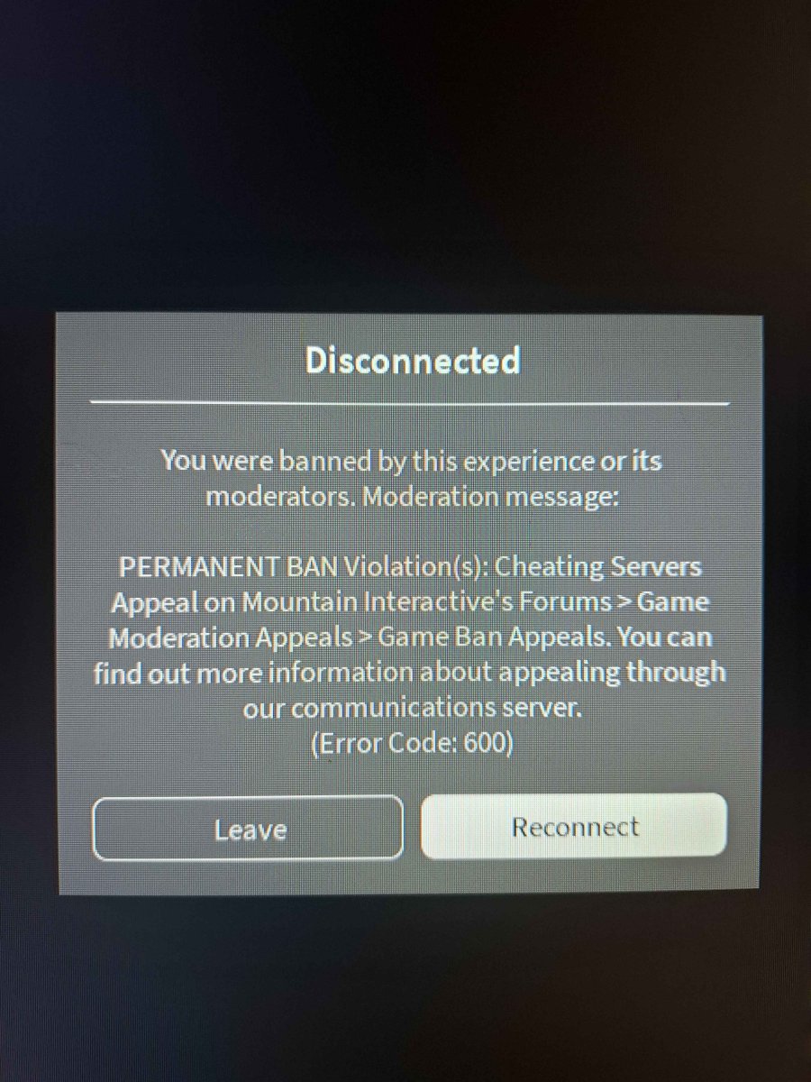 Roblox Username & User ID: spoks999 https://www.roblox.com/users/842459282/profile Discord ID: spoks999 Staff Member Who Banned You (optional): It didn't say What Happened: I tried to join a server and got the message image linked Ban Reason (as shown in the ban message): PERMANENT BAN Violation(s); cheating servers Why I Should Be Unbanned: honestly no idea why I got banned in the first place I hope to be unbanned I adore this game.