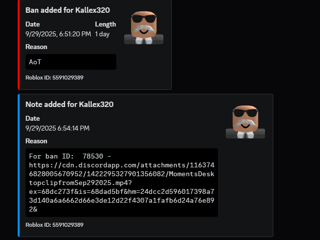 Roblox: Kallex320 & 5591029389 Discord ID: 1257134035189104651 Staff Member Who Banned You (optional) Unable to find, Ban ID: 78530 What Happened? Okay so we were in the middle of a pursuit with a Rogue FD vehicle as I was in UC Uniform and also a UC vehicle and as we were chasing this FD vehicle the FD ladder ended up desyncing my vehicle and made my vehicle get stuck in the ground so at that point as the pursuit continued on I just got out and ran over to a unmarked explorer grabbed the spike strips and yes after reviewing the clip I should've most likely told him or asked what I was doing but after he noticed I had the strips he was like "should have just asked" and I acknowledged that and kept them out and it seemed he had no problem with it at that time and at this point I was assuming the ladder truck would come back on Florence BLV like it did multiple times previously so I waited with spikes and after a while I mostly acknowledged and assumed the ladder wasn't going to come back after a minute of waiting so at this point the officer picks up the spike strip box and a couple seconds later you can see me placing the spike strips in front of his vehicle and this is were the issue arises, I had no INTENT in for him thinking I was placing the spikes Infront of his vehicle to pop his tires the first thing that came to my head since the spike strip box was gone was just to place them down and assume he would pick them up since they were originally in his vehicle so when I placed them down I ran off down the Florence BLV and hopped into an alley way to get to my friend that was on Brighton street as he was on SBI as well so at that point I get tased and I didn't even notice him behind me until right when I jumped over but it was to late because I got tased at that point and then hers another issue I have with the ban message because it just cuts there and the next 2 minutes we were there is just missing so after the clip ends I flashed my SBI badge when I got up and he immediately says "!help" and I'm like confused because what FRP or AOT has gone wrong there as nothing has been taken out of character until now and another FCPD unit comes here and I basically give her the run down from the start and when he picked up the spike strip box and to the point I placed them and till I was tased, so like 30 seconds after this a SBI unit shows up and the other FCPD unit gives them a semi rundown of what happened and the SBI officer doesn't find anything and leaves like not even a minute later and at this point everyone clears out and by the time this was all done my other friend that was previously on Brighton street is done with the scene they are on so they pick me up after everything is over and I eventually get off a couple minutes later. Now my issue arises when I rejoin; I'm banned for "AOT/FRP." Now I don't really see myself abusing my authority because after I was originally tased, I complied and even talked with them all. I have no intent to abuse my authority. The second issue is the "FRP" part that wasn't even listed in the original ban message on Discord logs. Not once in that clip was there any "failing roleplay" until he took it out of character and said "!help," which he didn't even provide in the clip directly after I was tased, and this is just the issue I have. Ban Reason (as shown in the ban message) Why Should You Be Unbanned? I do apologize sincerely for the lack of communication that was in that scene, but I do honestly think a lot of context was missing. I can also see the point of view from the other side, as I just placed the spike strips in front of their car and ran off. I had no intent of abusing authority. The spike strip placement was really not an attempt to bypass and use my authority for leverage; there was obviously miscommunication, which did fail on my part, and after I was caught up to and tased, I fully did comply, never resisted, and even openly explained everything to everyone else. I'd like to also add there is a big portion of context afterwards that is missing from the original clip that was used for my ban that had SBI, cooperation, and other units. I accept any guidance or explanation for this, and I do sincerely apologize for what happened, but I think there is a big portion of this that is missing.