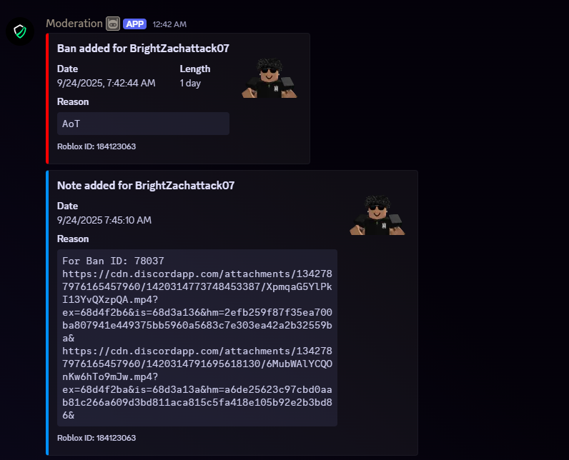 Your Roblox Username & User ID BrightZachattack07/ 184123063 Your Discord ID 392335814098681876 Staff Member Who Banned You (optional) chappie342 What Happened? So, an Officer was chasing a suspect (Moderator) she pulled out a gun, but as soon as she pulled out her gun, she got pepper-sprayed. The officer then began shooting I was confused because the suspect was unarmed and so I tackled the Officer and put him in cuffs then grabbed the suspect. The officer then provided me a clip of her reaching for her firearm. So I let the officer go, and arrest the suspect (Moderator). Her Moderator Friend, then pulled her out of my squad car while she was in cuffs helping her to escape. I then arrested her friend and put them both in my car while I speak to that officer. Then waiting for a safe time to read out there charges, I told them there charges. I was later banned for FRP? For not explaining there charges multiple times? And spoke to the mod who banned me saying that I have to by the Law Of Conduct repeat there charges multiple times which is also a lie. Ban Reason (as shown in the ban message) Why Should You Be Unbanned? Everything what I did was lawful and justifiable, I noticed how they also never provided the full clip. Chappie the Mod saying how I must repeat there charges whenever they ask is a lie, and just wanted a reason to ban me. https://medal.tv/games/roblox/clips/lcEQjbE0WiB5An3XV?invite=cr-MSxWTlYsNTA0NzQ0ODI&v=20 https://medal.tv/games/roblox/clips/lcD7tKqyuzlXjKOGn?invite=cr-MSxkRmosNDE3MzQyODk2&v=60 image.png.url