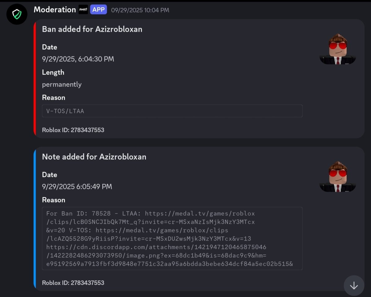 Discord id 1432133721879744602 Roblox id 2783437553 Roblox username: azizrobloxan I know I left the game during an arrest, and I understand that’s against the rules. I shouldn’t have done it — it was wrong to leave mid-RP because it ruins the experience for the people involved. No ai support At the time, I honestly panicked and didn’t think about the consequences. It wasn’t out of disrespect or to break the rules; I just made a poor decision in the moment. I take full responsibility for that. Since then, I’ve gone over the Project Ventura rules and I understand why things like LTAA are taken seriously. I really enjoy playing on the server and appreciate the effort that goes into keeping RP realistic. I’d like to come back and prove that I can follow the rules properly this time. If there’s a chance to reduce the ban to a temporary one or give me a final warning, I’d be grateful. I just want a second chance to play fair and be part of the community again. Thanks for taking the time to read this and for keeping the game organized and enjoyable for everyone.