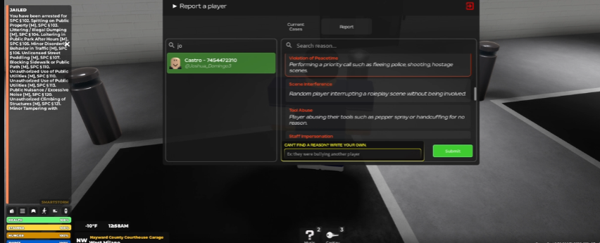 Your Roblox Username & User ID* 2. Your Discord Username Ricardo_Rodriguez Section 2: Offender's Information Please provide as much information as you can to help us identify the correct user. 3. Offender's Roblox Username* 4. Offender's Discord Username (if applicable) Section 3: Incident Details Provide a clear and factual account of the events. 5. Date and Approximate Time of Incident* 6. Location of Incident* 7. Detailed Description of Events* I was detain by VHP because I save a undercover police life in a shooting they were gonna investigate me until Joshua_Domingo3 came and took me and book me for random charges its on the clip. 8. Specific Rule(s) Violated* Section 4: Evidence https://medal.tv/games/roblox/clips/luT76PjVaOx-_fL5e?invite=cr-MSxadUcsMjMzNjk1OTM0&v=598