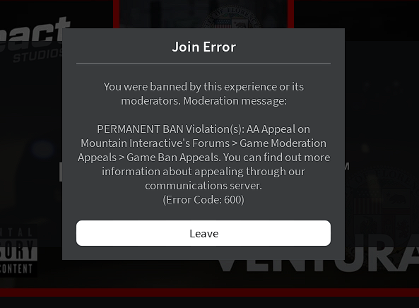 Your Roblox Username & User ID fintoptastic1275-899522287 Your Discord ID 865632053982789662 Staff Member Who Banned You (optional) no clue What Happened? I got banned for AA Ban Reason (as shown in the ban message) Why Should You Be Unbanned? First of all i don't have any alt accounts linked to my main account, second of all i really really enjoyed this game its one of the few games that i love on Roblox i really loved the roleplay and real life immersion this game had to offer and i am always thinking about wanting to play it i would really appreciate it if i could be unbanned so i could continue to play this amazing game I've already been banned for over a month and i am dying to start playing the game again. therefore i am asking that you remove the permanent ban, thankyou.