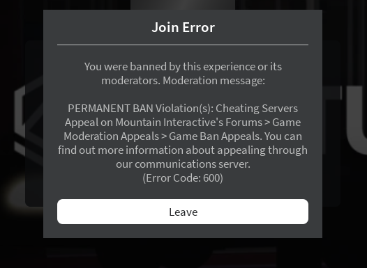 1. Your Roblox Username & User ID Jacksonvill_20221 3269025706 Your Discord ID 961843459256377364 What Happened? I was banned from Ventura for the reason " Cheating Servers " I do not use cheats the only reason I couldve got banned is from when I desynced someones vehicle on accident before I was about to leave the game, other than that I dont know why I was banned for " cheating " whenever I try joining any other mountain interactive games I get the same join error message. Ban Reason (as shown in the ban message) Why Should You Be Unbanned? I feel it would be right for me to be unbanned because I was not cheating at all and have never used cheats ever.