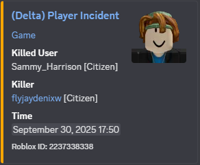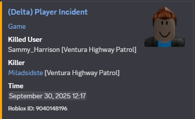 Not long after loading and in-team menu user suddenly drives up next to me and randomly shoots me no prior interaction. Time of incident: Logged In Kill Logs Evidence: https://medal.tv/games/roblox/clips/lcZjwSunZbzG2lAo4?invite=cr-MSwySUosNDAyNjQzNTc3&v=120