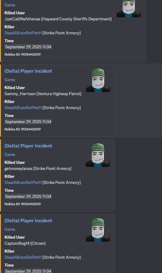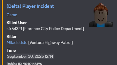 User had gone around and mass killed till they LTAA as a VBI had detained. Attached is a clip unfortunately not brilliant as I was tapped out sorting things when I tapped back in as I heard myself being dragged from my vehicle so I've attached some kill logs to back this up. Clip: https://medal.tv/games/roblox/clips/lcTBv6U0PdFqV2i9k?invite=cr-MSxSakosNDAyNjQzNTc3&v=51