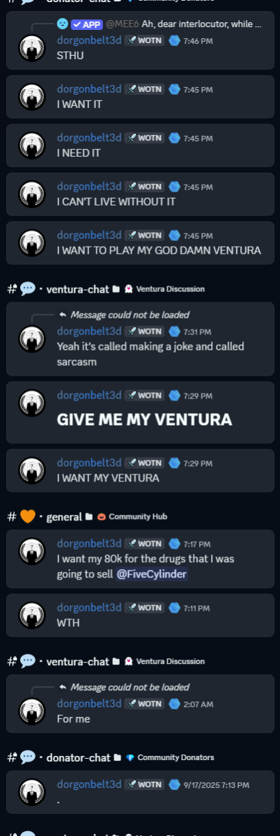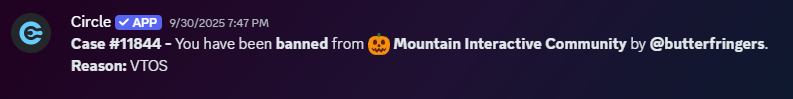 My Ban Appeal Appealing Discord ID: 1155548185893285938 Ban Length: IDK Ban Reason: Answer. Why I Should Be Unbanned: I should be unbanned because I have done absolutely nothing to be banned from the Mountain Interactive Discord, all I will say is that I was frustrated because I got kicked out after I was about to go sell Crystals, I looked in the Discord and started messing around a little bit and said "I need my Ventura" and "I want my ventura", it was obviously a joke, if I could be unbanned that would be amazing. Additional Members Involved/Witnessing: N/A