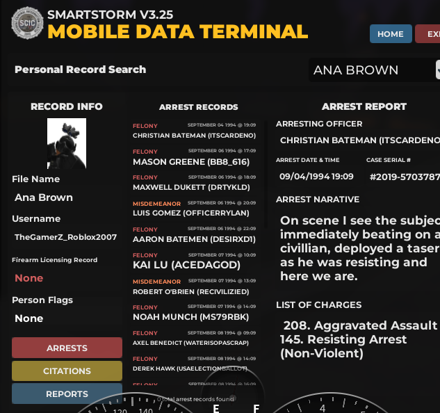 Reporter Roblox Username & ID*: TheGamerZ_Roblox2007:3007658444 Reporter Discord ID*:716037148901507085 Offender Roblox Username*: TheGamerZ_Roblox2007 Offender Discord Username*: tylertateOptional, but very helpful. Incident Description*:Suspect was pulled over after being suspected of assaulting two FD members he did pull over but ended up taking off resulting into him crashing and running on foot shortly after I tazed him he left the game I also seen him log from another officer trying to arrest him hence is why I'm taking the time to actually report him Rules Violated*:Combat logging Evidence to Support your Claim*:Untitled video - Made with Clipchamp - 2025-09-18T171056.630.mp4