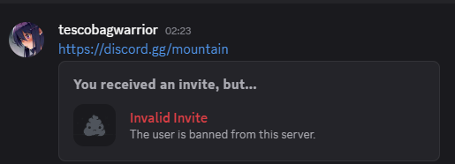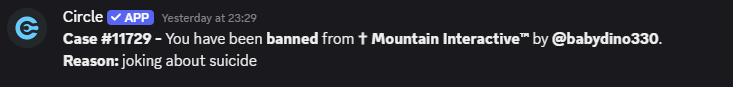 1. Appealing Discord ID: 308314430578360320 (c_ougar) Ban Length: Permanent Ban Reason: Joking about suicide Why I Should Be Unbanned: I am genuinely sorry and did not know the server had such strict rules on the theme. I said jokingly that if the game "doesn't get fixed within 5 milliseconds" I would "kill myself". It was not ill fated and I will keep in mind to not make comments as such again. I understand what I did wrong and did not think at that given moment that It would be offensive/triggering to some people. Additional Members Involved/Witnessing: Please ensure you have thoroughly read and understood the ban appeal rules before submitting your appeal. It is important to follow these guidelines closely to ensure your appeal is considered. Additionally, refrain from sending direct messages or harassing staff members about the status or outcome of your appeal. Patience and adherence to the rules are crucial in this process.