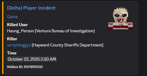 My user: Haung_Person:608239058 .huang (discord) Reported user: scriptdoggyy:8121893032 User RDM during an arrest. Clip:https://medal.tv/games/roblox/clips/lmhEfEC1SA1NRdUqc?invite=cr-MSxseE4sNDMyMjc3&v=60