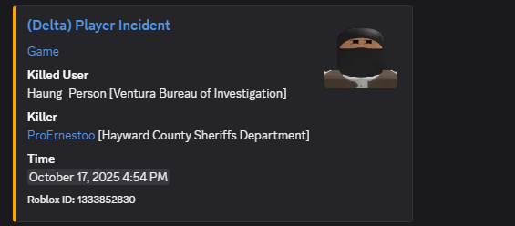 My user: Haung_Person:608239058 .huang(discord) RDM User: ProErnestoo:1333852830 User was driving recklessly and decided to flee upon stop. When I tried to detain him, he just randomly opened fire. Clip(RDM): https://medal.tv/games/roblox/clips/lk3tPAy1Y9tN_X_Ot?invite=cr-MSx2THosNDMyMjc3&v=60 Clip(ramming into me):https://medal.tv/games/roblox/clips/lk3s2jN5EyT71tztI?invite=cr-MSxvWjksNDMyMjc3&v=31