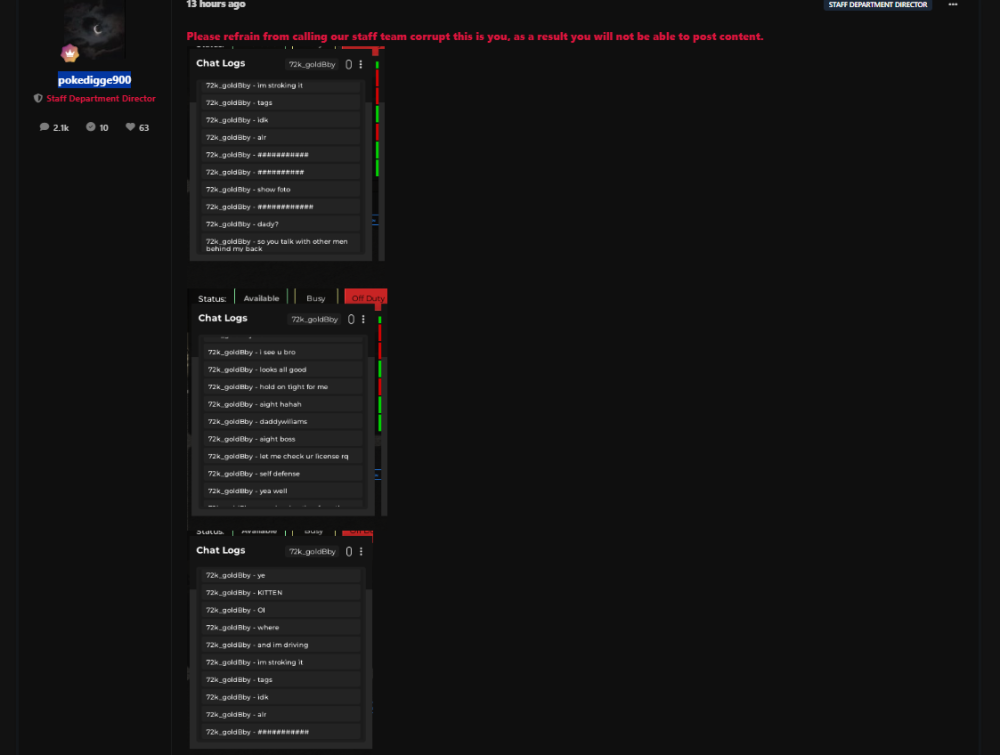 Your Roblox Username & User ID 72k_goldBby 2357040511 Your Discord ID 1193930714836652103 Staff Member Who Banned You: I dont really know his user but i got the whole Ban clipped on Medal. What Happened? So i was playing having my fun, and then i saw this girl getting persuited by the cops, so i tried helping the cops, as i knew the one cop from before, after that the girl that got persuited got stopped and arrested, and i was making jokes like get the kitchen girl and stuff like this, basic jokes freedom of speach right?. then the one moderator that was appearently in the car, got out turned his Voice chat on and said, yeah ur getting V-TOS banned its unappealable have fun, while laughing and stuff. i said like why what did i do and he didnt respond me, i hope this doesnt get instandly closed now because its a V-TOS ban, if so he won 100% he knew no one will give a **** if its Marked as V-TOS this is unfair as i had many hours in this game too, also in Ventura, if you click on discord the ban reason nothing comes up. Ban Reason Vtos For Ban ID 78890: https://discord.com/channels/902369439545180180/1424208141951701154 Why Should You Be Unbanned? What i said is wrong its true, but getting a perm ban for that and calling it Vtos so the moderators wont even look at it is unfair dude, i deserve an off time or a week ban but not permament? i wanna have fun again while playing this with my friends, and i wont say this stuff to women again even tho im joking, and she also did jokes about sizes etc. Thank you. pokedigge900, let me explain now everything maybe there is a missunderstanding , daddywiliams was a joke as u can see i was arresting a guy and he was talking in vc, his user was something with davidwiliams. so you talk with other men behind my back, i said that to a girl ik as a joke i have proof of it. I said im stroking it as another guy said hes having an affair with his gun in vc and i went to him and made that joke, we both over 18+ ive never said that to a girl or anything is this the only proof you got? is this the reason i got permament banned?. you guys didnt even check who i said this to or why simple just ban him we dont care about our community. so because of those 2 words i getting called a sex offender or what? please rethink this and maybe reduce my ban time, i wont say ts again even tho i said it to my friend and didnt had vc on my end, also got proof of that. thank you poke.- In-Game Ban Appeal False corrupted moderators no Evidence