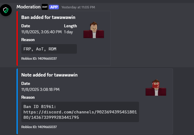 2. Your Roblox Username & User ID tawawawin - 1409665037 Include both your username and user ID so we can locate your account accurately. Your Discord ID 1427138481095708792 Please provide your full Discord ID, not just your username. Staff Member Who Banned You (optional) idk What Happened? when i woke up i just got banned from the for 1 day Ban Reason (as shown in the ban message) Why Should You Be Unbanned? i didn't do nothing wrong I just woke up and I just got banned if I did something wrong I'm sorry it wasn't unnecessary.