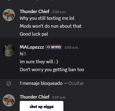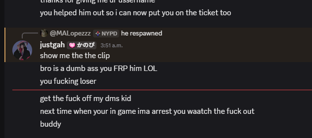 Roblox username: https://www.roblox.com/es/users/1498293189/profile Roblox id: 1498293189 2// My discord username [sorry i dont know id] miguk_08855 ----------------------------------------------------------------------------------------------------------------------- ----------------------------------------------------------------------------------------------------------------------- ----------------------------------------------------------------------------------------------------------------------- 3// Offenders information Roblox username: Cowboybullrider24 //// his link: https://www.roblox.com/es/users/5094385827/profile?friendshipSourceType=PlayerSearch Discord ussername: cowboybullrider24 ----------------------------------------------------------------------------------------------------------------------- ----------------------------------------------------------------------------------------------------------------------- ----------------------------------------------------------------------------------------------------------------------- 4RD incident details Time zone that happend: in discord server, around 3 and 4. This happend in discord server and in private message the context was that the guy rdmed me in game i did a ticket and asked in the discord how did i frp him if i was only following him to centrall jail to see my friend, so He takes out his gun and kills me, he says that it was beacuse i had an ar, and his friend sbi didnt taked action of it, so he created 3 or 2 accounts to harrass me telling that if he sees me ingame hes gonna arrest me so i better watchout [proof will be sended of messages] What specific actions did the offender take?: Real life harras // V-TOO /// Out game rp revelant messages [Draged files] No witnessse since it was private chat Rules that he broke: PG. Random/unrealistic acts // V-TOS, Real life harrass and threats ----------------------------------------------------------------------------------------------------------------------- ----------------------------------------------------------------------------------------------------------------------- ----------------------------------------------------------------------------------------------------------------------- Evidence was dragged in images Confirmation I confirm that submiting this reports confirms the information provided and true, Notes: He tried to pull in an innocent sbi making like he was his friend and started telling that i was getting arrested.