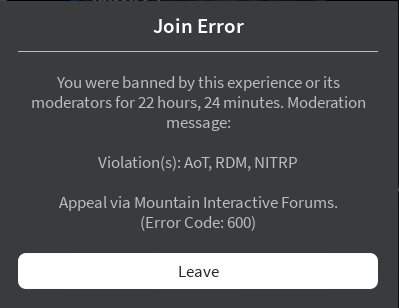 Hello, I would like to appeal for my 1-day Game Ban, my Roblox username is mandm0605, my ID is 423528040, my discord username is 9a3v, my ID is also 1337839630539821241, I don't know who banned me, I was banned for AoT, RDM, and NITRP, my ban reasons are provided in a picture, I should be unbanned because I do not abuse my tools, I was arrested already for RDM, I do intend to roleplay, I did not try not to, I played for like 3 hours straight, and if I abused my tools I am guessing it was from reports of people who were arrested earlier, and or during the time I was a cop, for no reason, I arrested everyone for a reason and followed higher ups orders, I really want to roleplay again in Perris and in Ventura, as I like the game for no only its popularity but the actual work the devs put into it, such as the gun work, the medical actions, and radio systems, I actually love it, I hope I can get unbanned within a couple minutes, and if not I will already be unbanned tomorrow, please and thank you - mandm0605.