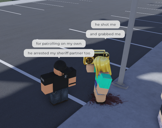 This guy arrested me as a sheriff for patrolling on my own Arrest another sheriff for another reason Claimed patrolling on my own was AoT shot cops and then left https://medal.tv/games/roblox/clips/lk0fel2evk5rfdJdD?invite=cr-MSw1bWksMTkxNDQ5Mzky&v=11