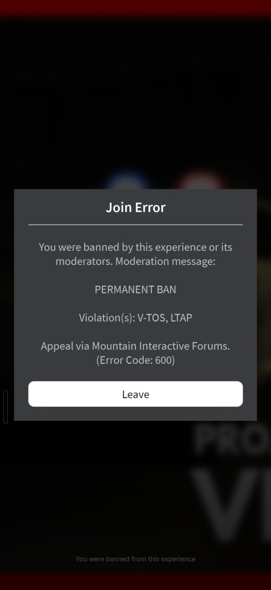 3. Hello Mountain Interactive Team, I recently received a permanent ban with the message "Violation(s): V-TOS, LTAP" and error code 600. I believe this might be a misunderstanding — my internet connection suddenly disconnected during the session, and I did not leave intentionally to avoid punishment. I sincerely apologize for any confusion caused. I really enjoy your game and would greatly appreciate a second chance. Please consider reviewing my case. I promise to follow all rules carefully in the future. Thank you for your time and understanding. Kind regards, Stef123321123