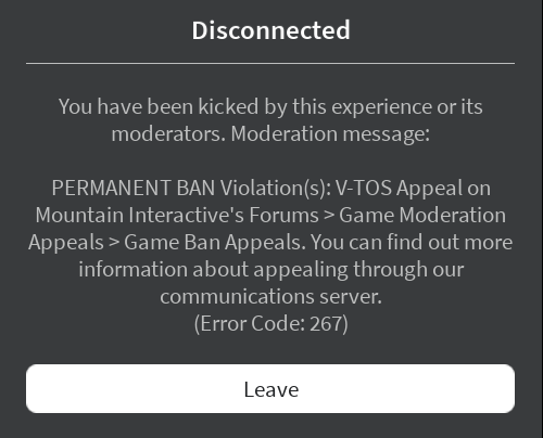 1. 1. Roblox Username & User ID - ThronedKaddin - 5430677412 2. Discord ID - 943586574766047232 3. Staff Member Who Banned You (optional) - N/A 4. What Happened? - Not sure honestly, I was asked by a friend to play this game called "Ventura" (Your game) and all of a sudden I get a moderation pop-up that I have been banned, yet I never played this game before. 5. Ban Reason (as shown in the ban message) - *Ban Reason Screenshot is Uploaded below.* 6. Why Should You Be Unbanned? - I should be unbanned because I want to play with my friends, a good amount of them play this game and always speak highly of it so I decided to finally join them and try it out when I come to find out I have been banned for no reason. I have never played the game before, It says something error code 267 if it's the error code I am thinking of then I had the same problem with Greenville and appealed my ban. I got unbanned due to me buying this account about 3-4 Months ago, whatever the dude did on this account is the past does not reflect me and what I do/stand for. I want to play this game and I'm hopefully looking forward to getting this issue resolved soon.