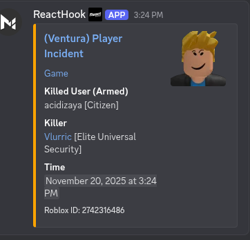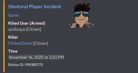 Reporter Roblox Username & ID*: acidizaya:9215574859 Reporter Discord ID*: 1045127944399491072Offender Roblox Username*: Vlurric Offender Discord Username*: N/AIncident Description*:Detained me for no reason, shot me for no reason after getting caught, pretty sure its an alt. (0 connections, followers or following) Rules Violated*:Tools abuse RDM Evidence to Support your Claim*: StreamableWatch untitled | Streamable