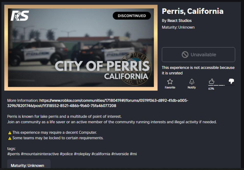 Roblox moderation took the game down, it appears to be because it has no rating. I recall there previously being a rating - are y'all permanently closing it or is this an actual roblox moderation issue?- Wikkcraz4702 rogue LEO