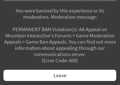 Your Roblox Username & User ID rprp_98 7463037475 Your Discord ID 1186674020989546538 Staff Member Who Banned You (optional) i dont know? What Happened? i got band on 3 alt users and got perma band for aa i dont blame them. Ban Reason (as shown in the ban message) you have bin band for AA Why Should You Be Unbanned? I know that aa is a serious offens and i now that a simple apology is ent going to help me so. I am doing a real forgivnes text i now what i did was wrong but i did it anyways i was so stupid and idiot to do this and i swear on my life that i will never do this again. And i just want to say sorry to the admins having to dele with me insted of doing other stuf like helping folk and mor i really men this apology from my heart i am so sorry for what i did and i will never do the **** i did again. and i will probably not get un band but that is ok because i have now let the Mountaininteractive team i am truly sorry... - PERMA BAND FOR AA