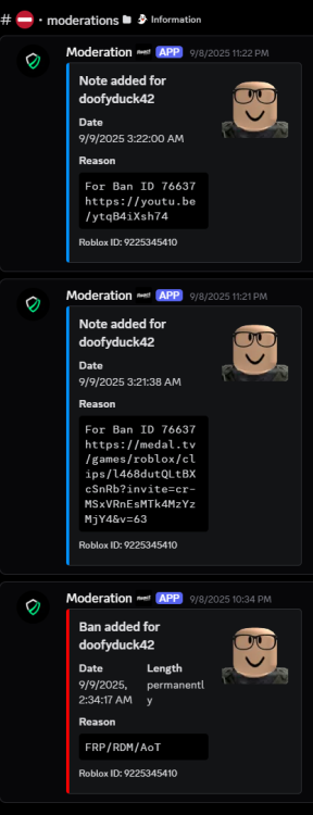 To add onto my reply from an hour ago I found one of the accounts and they were in the react studio's group, the id to the account is 9225345410. I looked in the moderations discord channel and this account was banned on 9/9/2025 for FRP,RDM,AoT. I'd like to make myself clear I did NOT have access to this account at this time, it was a shared account between me and a friend from 2 months ago when it was made, we were planning on learning roblox studio together. Soon after that is when the above happened and I lost contact with him as well as him changing everything, I repeat I did NOT and I still do NOT have access to the account at the time of the ban. I did HAVE access to it like 3 weeks prior of the ban though, maybe a little less. This is a link to the reason for that accounts ban (For Ban ID 76637 https://medal.tv/games/roblox/clips/l468dutQLtBXcSnRb?invite=cr-MSxVRnEsMTk4MzYzMjY4&v=63)