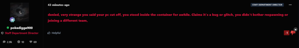 Your Roblox Username & User ID Tramman2929 - 3251956963 Your Discord ID 1200861234946375956 Staff Member Who Banned You (optional) N/A What Happened? I was playing all afternoon with my friend, 11/3/2025,, we were just grinding money by doing chemicals. On our way to sell we drove very fast into the truck/containers at the sellers location and both of us got flinged pretty quick along with our car. I ended up in a dark spot and had literally no idea where I was and didn't really care much about it as funny glitches like these happends from time to time. After getting bored of a pitch black screen I eventually left the game and turned my computer off. I later noticed that I got banned for Glitching / Exploiting. Sure this was a glitch, but it was definetly not on purpose and I believe this is a big missunderstaning. Ban Reason (as shown in the ban message) GL/EXP - Ban ID 81470 The moderators proof: https://medal.tv/games/roblox/clips/lr4cNzAN9aXBpyCVm?invite=cr-MSxSTWEsMjU5NjkxOTE&v=60 Why Should You Be Unbanned? NOTE: This moderator replied and said that my "Pc cut off" which I never said it did, I left the game on purpose because I had to go for the night. Yes I stood inside the container for a while because I was tabbed out and was talking to my friend through VC on Discord, so ofcourse I didn't bother trying to get out or joining another team because I was about to leave any moment soon anyways and selling my crystals was the last thing I wanted to do before logging off. I should be unbanned from Project Ventura because this happends to be a missunderstanding. A fun game like this will of course come with all sorts of glitches but me being banned over something that I got zero control over doesn't sound right to me. I have no other records in this game as in bans or warnings. I've played by the rules and I've enjoyed every second of this game experience. I had no intention in glitching and placing myself inside a container as shown in the moderators proof video. Excuse my poor grammar/spelling as english is not my 1st language. Best regards/