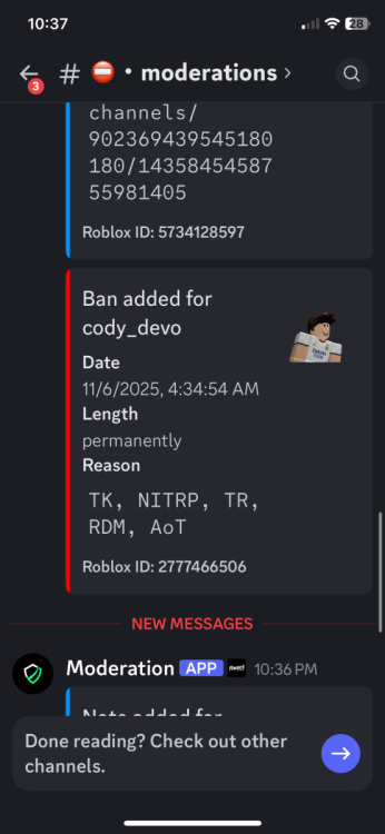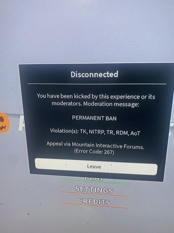 Your Roblox Username & User ID username: Cody_Devo User ID:2777466506 Your Discord ID Discord Id: 1392750222731378769 What Happened? So, what happened was, I was playing Ventura, and I was a VHP Officer and was bored and decided to go rogue. I got the team's rifle and, duty pistol and stole a civlian Dodge Challenger a black model. I saw a Trooper doing a traffic stop on a pinkish sedan and, I walked up to the trooper and magged dumped him. Shortly after, that a mod put me in a cell and I left after that. Ban Reason (as shown in the ban message) The ban message said "You have been kicked by this experience or its moderators. Moderation message: PERMANENT BAN Violation(s): TK, NITRP, TR, RDM, AoT" Here is the image: image.jpg Why Should You Be Unbanned? I'd like to apologize for my actions; I understand that team killing or going rogue is a very bad idea. I made a poor decision when I killed that, Trooper. I didn't realize that the person in the car was a Moderator at the time and I was bored and wanted some actions or morale booster for my Ego. Now, I understand that's not an excuse for breaking rules or fail roleplaying and team killing etc. I have put alot of hours in this game and have a total of 1,500 XP alone on the Law Enforcement teams. I also, spent actual money just to buy a Mouse for this game, and I really enjoy the community and RP side of it. I deeply appreciate a second chance to prove that I can follow the rules and take this RP seriously. if I'm unbanned, I'll play responsibly and will help other Cadets or New officers. I was also unaware of the rules because, I never had anybody tell me about it, I always thought this game was like ERLC. Thank you for taking the time to read my appeal, I also hope you have a Good day.