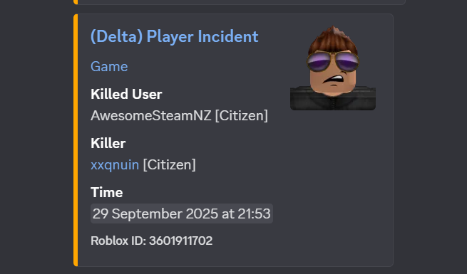 Posted Monday at 09:02 AM5 days Reporter Roblox Username & ID*: AwesomeSteamNZ 1198757990Reporter Discord ID*: 897300575081889802Offender Roblox Username*: xxqnuinOffender Discord Username*: thatisupIncident Description*: I was chilling there, this dude walks up to me, says some stuff I forgot what he said and then shoots me dead on the spot.Rules Violated*: RDMEvidence to Support your Claim*: https://medal.tv/games/roblox/clips/lcrnkPrskXXGkP7jm?invite=cr-MSxJVlosNjk0NDk3MjA&v=15
