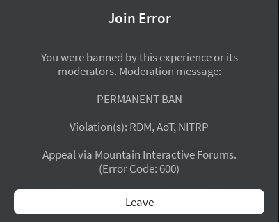 Why Should You Be Unbanned? Well to be honest I feel that this is unjust, not only is it that the reporter them selves was not roleplaying but also is a hypocrite. I also saw alot of violations in this game which havent been solved such as a moderator swearing (and thus a roblox vtos), I recorded that incident however I could find no one to speak about this.