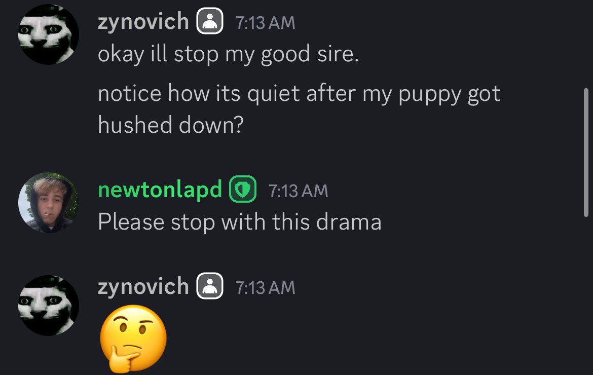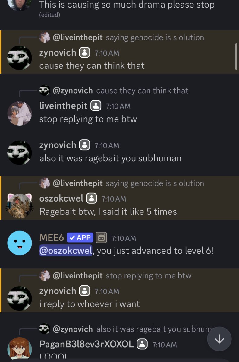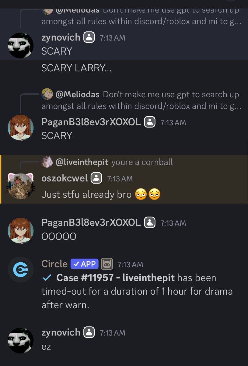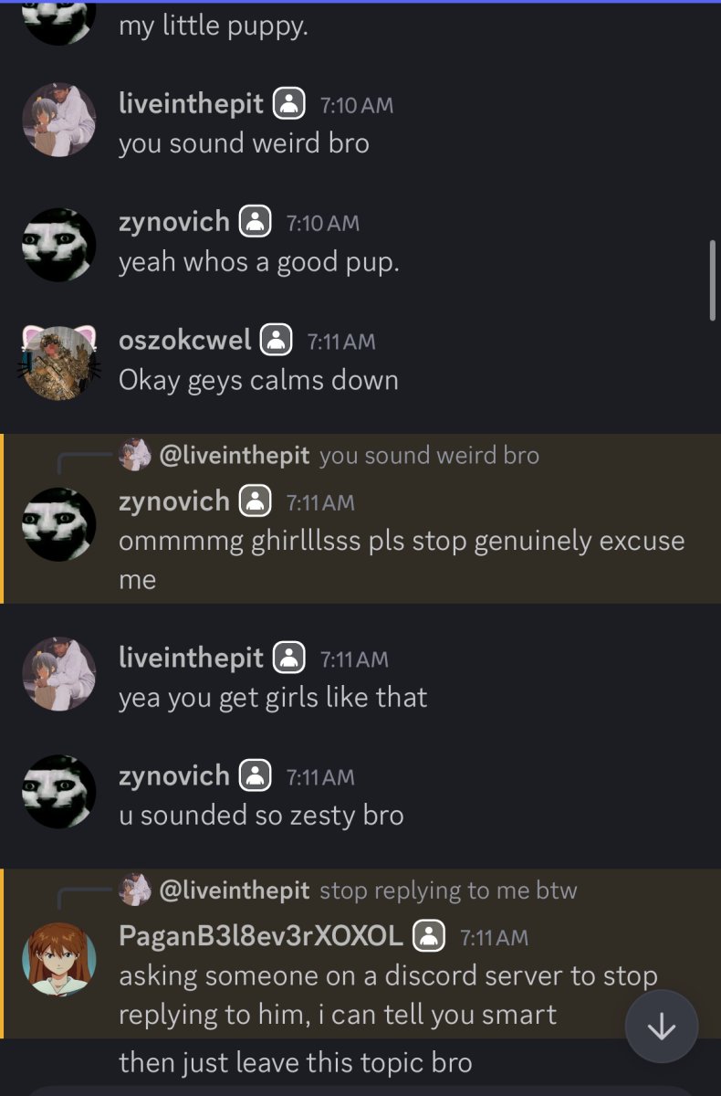 In the politics channel, where I replied to a comment, some people had come in and began talking and tweaking about I had replied. When he came in, he didn't reply directly to me, nor warn me, and after this little goon keeps calling me his "pup", I get muted for apparently "drama after warning"