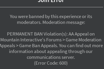 PERMANENT VAN Violation(s): AA Appeal on Mountain Interactive's Forums - Game Moderation Appeals - Game Ban Appeals.